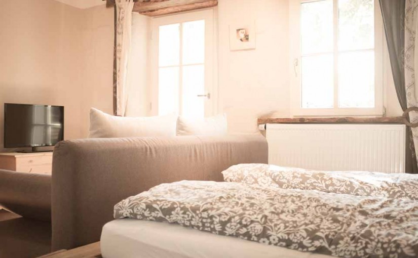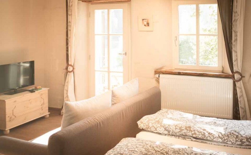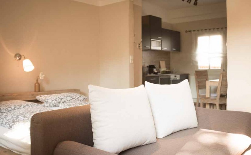 Der Wohnraum ist stilvoll eingerichtet mit einem 180cm breitem Doppelbett, einer Schlafcouch (140cm) sowie einem 32“ LED Smart-TV und einem DAB+ Internet Radio. WLAN ist kostenfrei verfügbar. Das Apartment bietet Platz für bis zu 4 Personen.